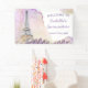 Personalized Welcome banner for your birthday party - or edit for any occasion. Welcome your guests with an elegant, Paris Themed Eiffel Tower Banner. The Eiffel Tower scene is complete with finely sketched gold floral accents, French lavender field of flowers with watercolor backgrounds. The design has a colour palette of lavender purple lilac pink and gold. The wording combines handwritten typography with modern uppercase typography and reads, "Welcome to [name's] Quinceanera [date]".