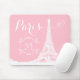 This chic pink mouse pad features a white Eiffel Tower graphic with "Paris" written in modern script. A monogram initial for you to personalize is framed by a white fancy scroll.