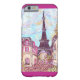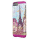Paris Eiffel Tower pointillism iPhone 6 case, art created by Kristie Hubler, inspired by Paris, France, the Eiffel Tower, and the shop facades inside Paris Las Vegas resort and casino. Also inspired by artist George Seurat. Has a berry coloured orchid fuschia top and bottom borders.