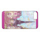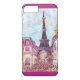 Paris Eiffel Tower pointillism iPhone 6 case, art created by Kristie Hubler, inspired by Paris, France, the Eiffel Tower, and the shop facades inside Paris Las Vegas resort and casino. Also inspired by artist George Seurat. Has a berry coloured orchid fuschia top and bottom borders.
