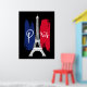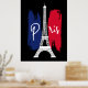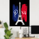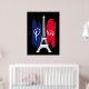Stylish artistic design featuring the Eiffel Tower with bold blue and red brush strokes, showcasing the word "Paris" in a modern, handwritten font.