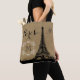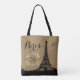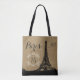 This chic tan tote bag features a black Eiffel Tower graphic with "Paris" in modern script. A monogram initial for you to personalize is framed by a white fancy scroll. Background is a faux burlap texture in tan.