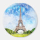 Paris Eiffel Tower Watercolor #01. A beautiful watercolor portrayal of the Eiffel Tower in Paris, capturing its intricate iron lattice structure against a vibrant, sky-blue background. The artwork emphasizes the tower's elegance and grandeur, with soft washes of colour and artistic splashes that evoke a sense of whimsy and charm. Lush green trees frame the base, adding a touch of nature to this iconic cityscape.