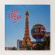 Puzzle présentant Paris Las Vegas à la tombée de la nuit, vue depuis la bande. La tour Eiffel de Las Vegas illuminée et la tour Montgolfier sont des enseignes emblématiques et des pièces d'architecture célèbres dans la ville des lumières et du divertissement. Le texte dit "Las Vegas" et il est totalement personnalisable. Vous pouvez également choisir le niveau de difficulté et par conséquent les prix.