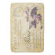 Vintage French postcard features beautiful typography, "Paris" and a purple ribboned box full of lilac flowers on distressed antique wallpaper background