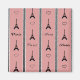 Paris illustration with Eiffel Tower and heart decoration and Paris text design on black, white and pink striped background
