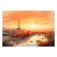The watercolor painting depicts the stunning Paris skyline at sunset. The Eiffel Tower stands tall in the centre of the painting, silhouetted against a warm, golden sky. The Arc de Triomphe and other iconic landmarks can be seen in the background, adding to the charm and romance of the city. The Seine River winds through the foreground, adding depth and movement to the painting. The style is loose and expressive, with blended colours and loose brushstrokes creating a dreamy, atmospheric effect. The painting captures the energy and vibrancy of Paris, evoking a sense of romance and enchantment that is quintessentially Parisian.