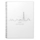 Minimalist notebook design featuring the Paris skyline with coordinates, a croissant & macarons