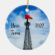 Two sided ornament featuring the Eiffel Tower of Paris, Texas on one side and a close up of the red hat on the other.