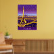 Poster in an impressionist illustration of Paris against a starry purple sky, featuring the Eiffel Tower illuminated in gpld