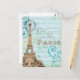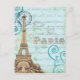 A vintage sepia image of the Eiffel Tower from the Paris expostion in the 1800s appears with a vintage Paris handwritten address and postmarks and text from Victor Hugo's Notre Dame du Paris on a background with faint branches and leaves in aqua. Matching items and many other vintage Paris designs are available in my Zazzle store.