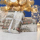 romantic Paris winter Christmas street scene illustrated in a soft painterly storybook style, elegant Haussmann buildings decorated with red garlands, wreaths, and ribbons, gently falling snow, evergreen Christmas trees with red ornaments and bows, warm glowing shopfronts with striped awnings, subtle repeating Eiffel Tower silhouettes partially obscured by snowfall, bare winter trees dusted with snow, cozy nostalgic European holiday atmosphere.