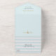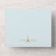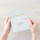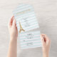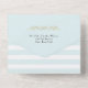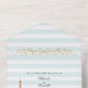Modern striped wedding Paris themed tri fold invitation done in light aqua and white horizontal stripe pattern, with graphics gold flourishes and a gold glittery looking Eiffel tower. Personalize the custom text for your special day.
