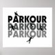 Modern Parkour free running design in black, dark gray, and light gray with silhouetted people running, jumping, hanging, and flipping.