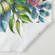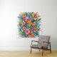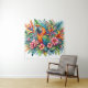 Colourful tapestry features a vibrant watercolor wild animal portrait of a multicolor parrot framed by a variety of flowers. Red, yellow, orange, green, blue, and pink make an appearance in this multicolor floral bird artwork.