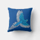 Throw pillow patterned with an Amazon Parrot in flight - cerulean blue and white against a deep cobalt blue background - digitally enhanced photography