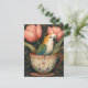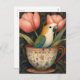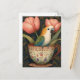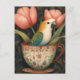 A charming illustration of a colourful parrot sitting in a floral teacup, framed by soft pink tulips. Perfect for bird lovers, flower enthusiasts, and collectors of unique art cards.