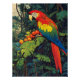 A vibrant parrot perched on a lush tropical branch, its colourful feathers glowing in shades of red, green, blue, and yellow under the warm sunlight. The parrot grips a ripe fruit in its beak, savouring the sweet taste. Surrounding it is a jungle teeming with thick, vibrant foliage—palm leaves, large flowers, and tropical vines—bathed in the soft, golden light of a sunny day. The air hums with the energy of the tropics as light filters through the canopy, casting dappled shadows across the scene.