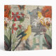 This image of yellow parrots and flowers is a beautiful modern collage of several antique painting prints of birds, flowers, and birdcages.