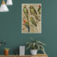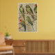 This colourful antique lithograph reproduction is of a variety of parrots that look as if they have perched outside your window, flashing brilliant hues of red, blue, pink, green, and yellow. They seem to be beckoning you outside to relax on a balcony overlooking a lush green landscape. Can you hear the sounds of the jungle yet?