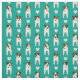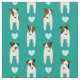 This Jack Russell Terriers fabric features a staggered, columnar pattern of eight illustrated JRTs alternated with white hearts - the dogs have varying brown and black head and body markings and each is displaying an irresistible doggy head tilt - customizable background is blue green - Jack Russell Terriers pattern © katz_d_zynes 2019