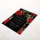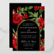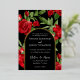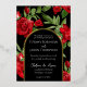 Floral arrangement sits behind the wedding ceremony details enclosed by an arch for this lovely red flowers invitation. The double arch is in real foil (gold, silver, or rose gold). The back of the invite is a small floral arrangement above the wedding date in white text on a black background.