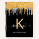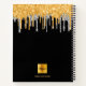 Un arrière - plan noir chic avec des gouttes de parties scintillant en faux or et argent à la mode, la peinture goutte à goutte. Personnalisez et ajoutez votre lettre monogramme, votre nom et un titre. Le nom est écrit avec un script de style moderne écrit à la main avec des swashes. Pour que les swashes ne suppriment que le nom de l'échantillon, laissez les espaces ou émoticônes devant et après le nom. Texte de couleur jaune et blanche. Un carnet avec des pages vierges. Utilisez-le comme carnet de croquis, pour gribouiller, dessiner des notes, pour l'école ou le travail.