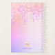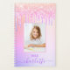 Un arrière - plan tendance aux couleurs pastel unicorne et arc-en-ciel rose, violet et or rose. Décoré avec des gouttes de parties scintillant en or rose, rose, violet et une licorne de couleur arc-en-ciel. Lettres violettes. Personnalisez et ajoutez votre nom écrit à l'aide d'un script de style à la main moderne avec des swashes. Pour que les swashes ne suppriment que le nom de l'échantillon, laissez les espaces ou émoticônes devant et après le nom. Ajoutez votre propre photo et une année.
