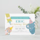 This cute " calling all party animals " boy's birthday invitation features party animals with party hats which are a giraffe, an elephant and a tiger on a white background accented with light teal / turquoise blue colour . The reverse side features a faux glitter gold background. Personalize it for your needs. You can find more woodland animal products at my store.
