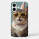 Cute and funny phone case showing a cat with a party hat and sunglasses amidst confetti. Perfect for celebrations and cat lovers.