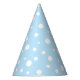 Party hat is shown in a cute light blue and white polka dots print design.