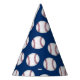 This is a fun hat to wear for a party. It features white baseballs on a blue background.
