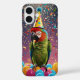 Vibrant phone case featuring a parrot with sunglasses and a party hat amidst falling confetti. Perfect for fun celebrations and animal lovers.