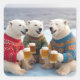 Three happy polar bears are partying on an Arctic glacier, wearing Christmas ugly sweaters and holding mugs of beer