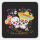 Feliz Dia De Muertos with Party Sugar Skulls - one wearing a Sombrero , colourful flowers and Maracas to show the Happy Mexican Celebration of the Day of the Dead on November 1