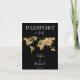 Invitation de mariage avec carte du monde moderne et élégante, comme un passeport avec carte du monde aquarelle à paillettes dorées sur fond noir