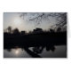 Photo d'une passerelle au-dessus d'une rivière prise contre le soleil de fin d'après-midi et le ciel lumineux avec silhouettes de personnes marchant sur le pont et le soleil réfléchi dans l'eau. Prise à Bute Park, Cardiff, Pays de Galles, Royaume-Uni