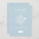 Passport to parenthood with globe outline and airplane on the front; passport style layout on the back with subtle world map behind; photo too