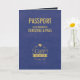 This passport wedding invitation, shown in warm gold and blue colours, resembles a passport and it is perfect for a destination wedding.