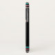 Stylish black iPhone case, with graphic artwork of a pastel abstract dragonfly and teal, pink and blush line borders, on the top and bottom. Personalize the teal coloured text for a very special gift idea for her.