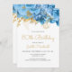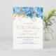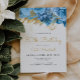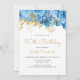 This elegant 80th birthday invitation features a floral top border of pastel blue flowers and gold faux foil leaves. . The words "80th Birthday" and the name of the guest of honour appear in gold-coloured casual handwriting script, with the rest of the customizable text in charcoal grey sans serif font. The floral design is repeated on the reverse side. Easily edit the text for any age birthday.