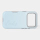 A trendy personalized pastel light blue iPhone case, with a soft gradient design and modern calligraphy script font.