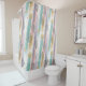 A vibrant and modern abstract pattern shower curtain featuring vertical brushstrokes in soft pastel hues—pink, purple, teal, and beige—layered with playful geometric elements. Dotted ovals and teardrops bring bold contrast, while textured gold circles and scattered golden dots add sparkle and movement. This seamless design merges painterly textures with structured accents, ideal for those drawn to expressive, artistic, and contemporary aesthetics.