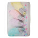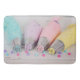 A bath mat with a pretty pastel coloured photograph. Featuring cake decorating items in pastel blue, pink, peach and yellow. Set upon a wood table with little colourful beads.