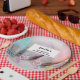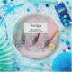 Paper plates with a pretty pastel coloured photograph. Featuring cake decorating items in pastel blue, pink, peach and yellow. Set upon a wood table with little colourful beads. A white rectangle with a pink border with your personalized text inside.
