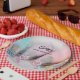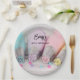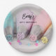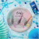 Paper plates with a pretty pastel coloured photograph. Featuring cake decorating items in pastel blue, pink, peach and yellow. Set upon a wood table with little colourful beads.