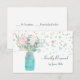 A whimsical blue green mason jar holds pale pink and white flowers with soft teal greenery on the front of this wedding RSVP card. A background of pastel pink and blue confetti combines with gold flecks to add interest and contrast to the delicate flowers. Your custom text is in darker teal. The back of the invitation is solid white to make it easy for your respondent to mark. Be sure to see the matching wedding invitations in our store. *This design uses artwork from LABFcreations on Etsy.