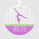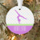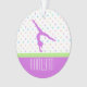 This gymnastics design features a white background covered in pastel coloured polka-dots. There is a gymnast in a pose in the foreground and a custom text field to personalize with a name before ordering.