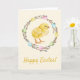 Destei's watercolor illustration featuring a yellow baby chick nestled inside a willow wreath. The wreath is decorated with colorful pastel Easter eggs. The background color is light yellow.