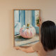 Bring a soft, whimsical touch to your fall decorating with this Pink Pumpkin with Bow Wall Art. Featuring a delicate pastel pink pumpkin adorned with a blue ribbon, resting by a sunlit doorway, this artwork captures the cozy charm of autumn with a fresh and modern pastel palette.